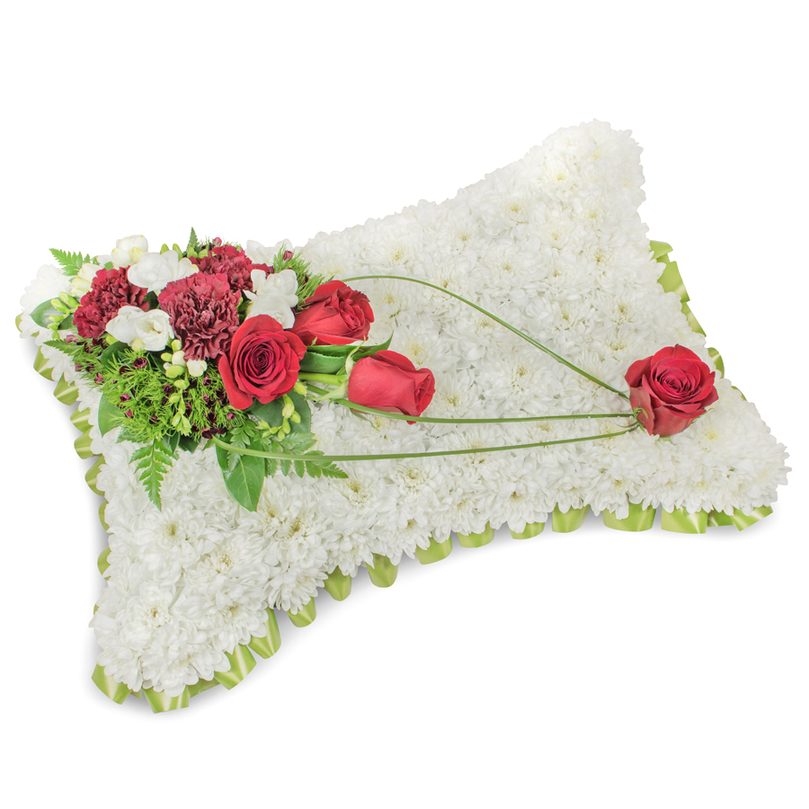 Express your sincere condolences with our Serene Thoughts Floral Arrangement. This elegant bouquet features white chrysanthemums, red roses, white freesias, and dark red carnations, beautifully complemented by dianthus and bear grass. The sophisticated design and vibrant colors make it a unique and heartfelt gift.